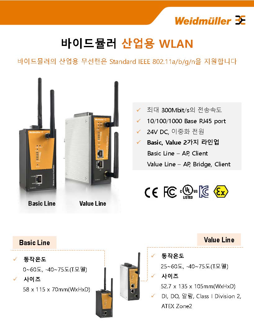 바이드뮬러의 산업용 무선랜은 Standard IEEE 802.11a/b/g/n 네트워크를 지원하며, ATEX, UL, KC 등 각종 인증도 폭넓게 획득하였습니다.